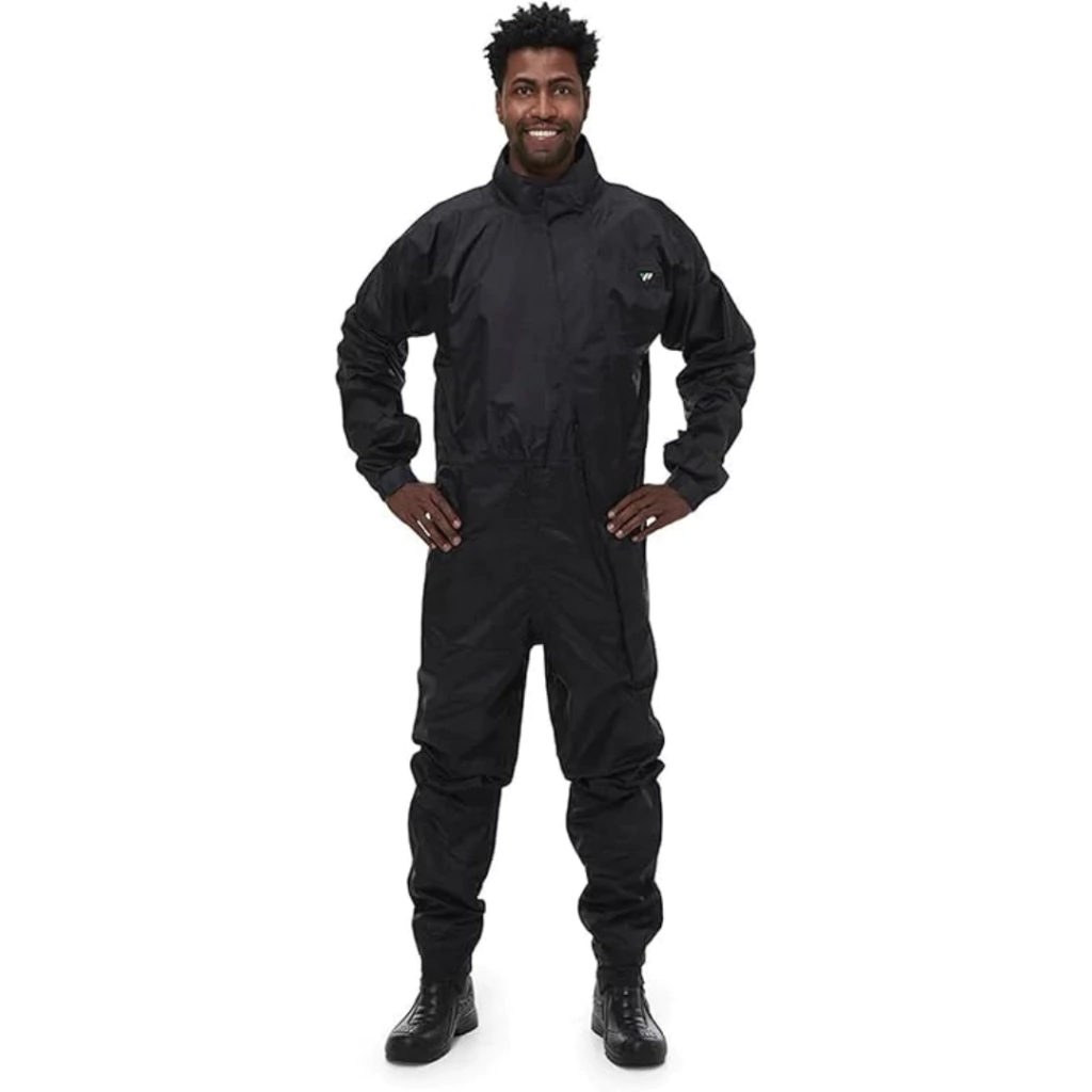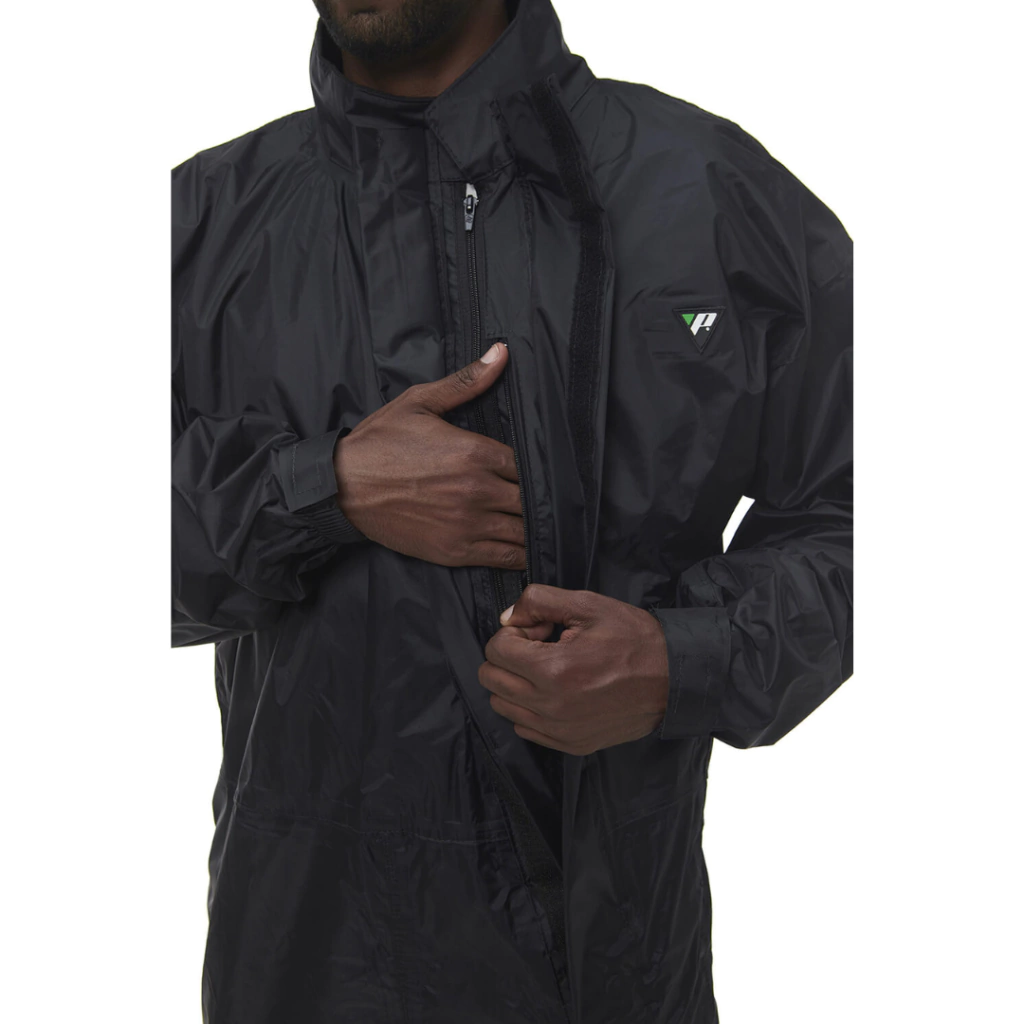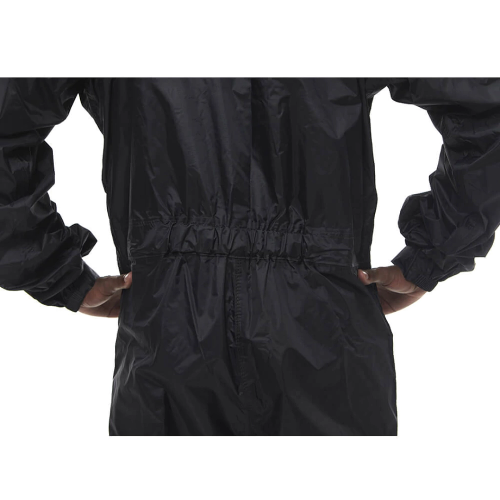 Macacão com gola forrada e com refletivo high gloss, abertura diagonal, punhos com elástico e fitas de contato (tiras autocolantes) e fechamento com de zíper e fitas de contato (tiras autocolantes). Bolso interno na parte frontal.